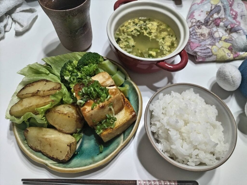 豆腐ステーキだけでは寂しいので、付け合わせにブロッコリーの茹でたものとじゃがバターも作りました。