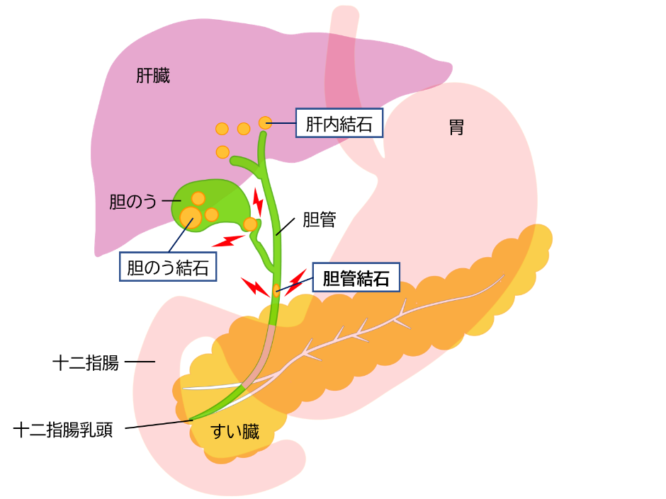 診断確定後の説明では、総胆管結石は肝臓から十二指腸へ胆汁を運ぶ胆管に石が詰まる病気で、放置すると急性胆管炎・敗血症・胆石性膵炎などの重篤な合併症を起こし、命に関わるケースもあるため、無症状でも積極的な治療が推奨されると聞きました。