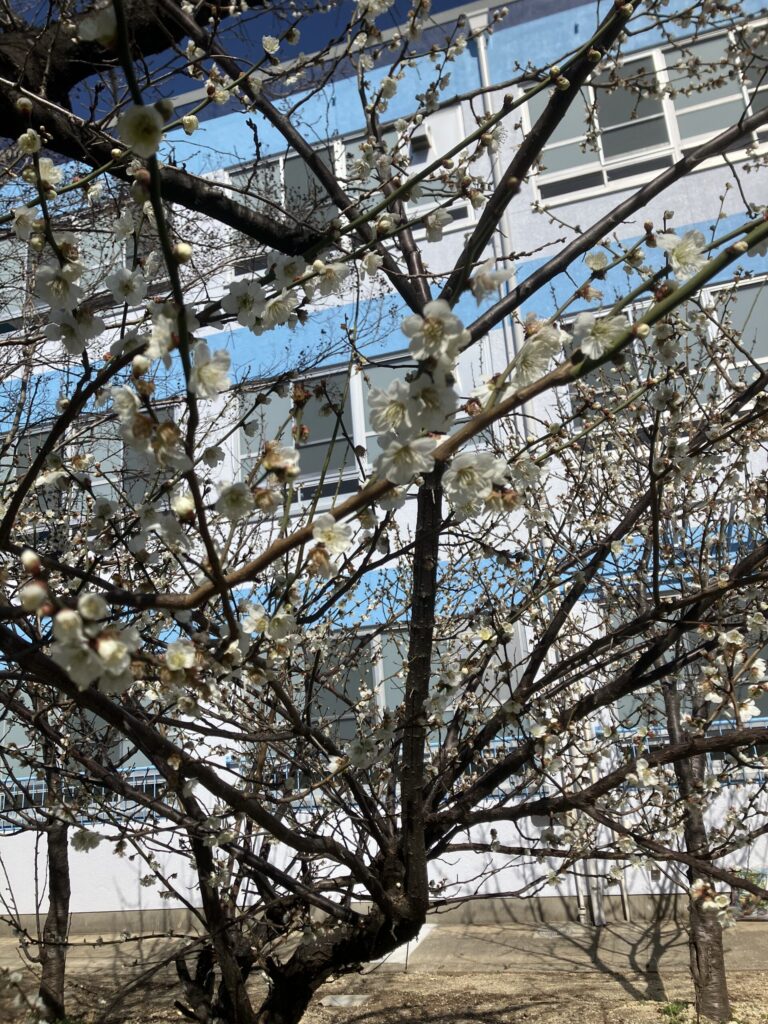 朝の柔らかい日差しの中、校庭の端に植えられた梅の木々に、白い花びらとピンクの花びらがふわっと広がっていました。